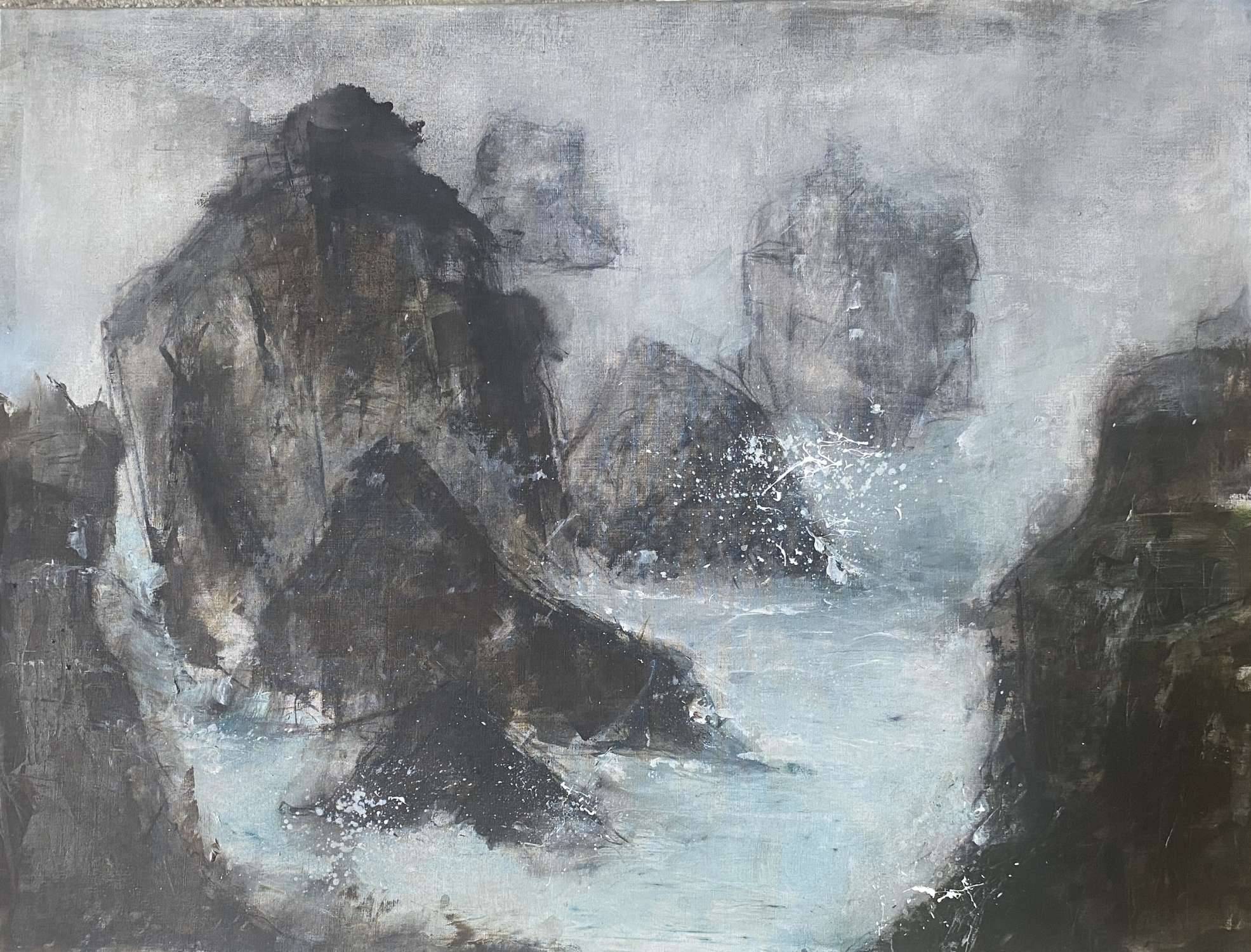 The Holmes is a large, expansive, acrylic and oil painting, capturing the vibrant energy of Fair Isles' high sea cliffs. Painted in shades of deep blue and aqua, with imposing dark majestic cliffs. it will conjure a dramatic presence in a room.