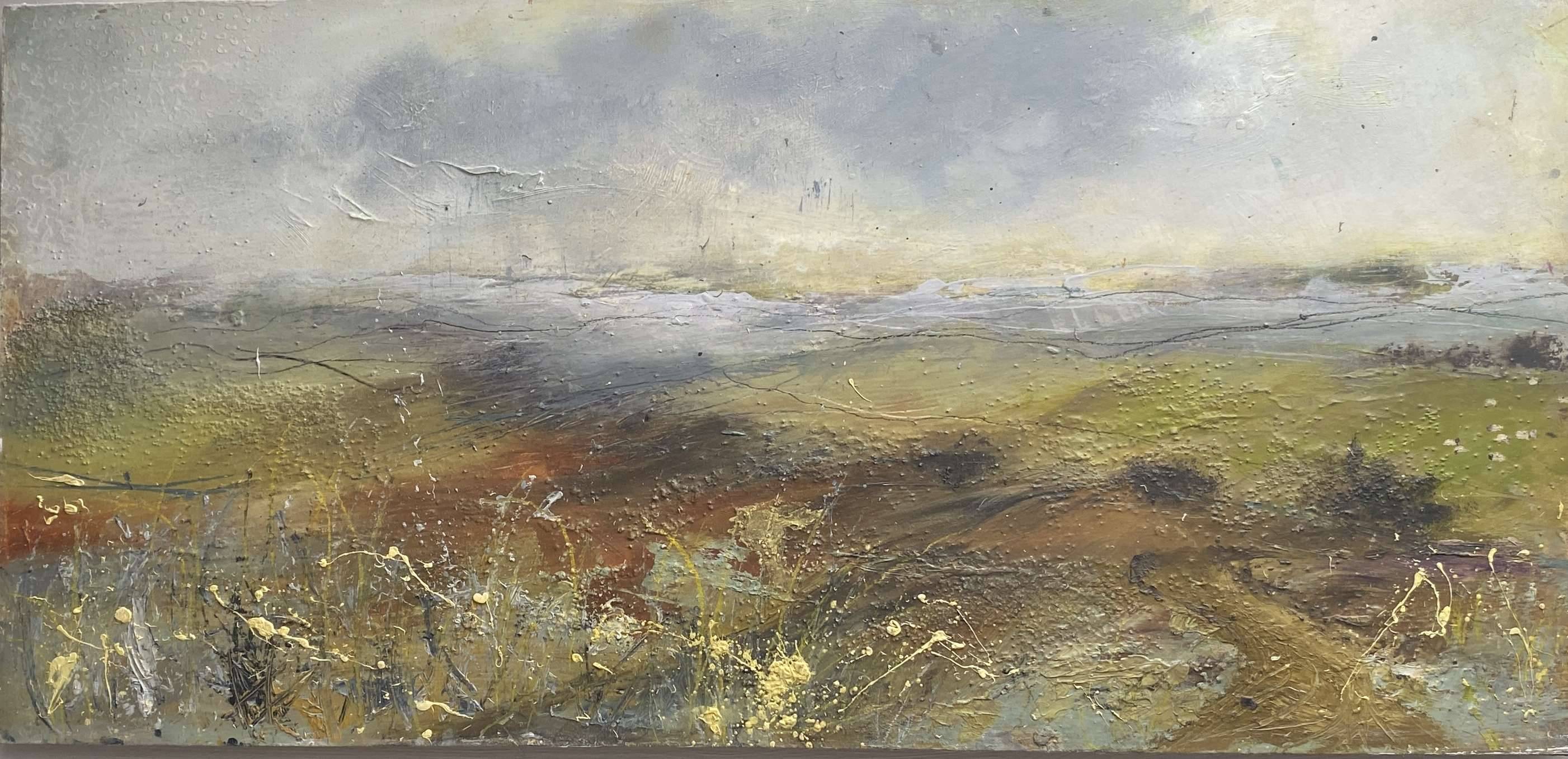 An expansive view of Saddleworth Moor, painted partially en plein air and partially in the studio. oils and mixed media using found materials to give the surface texture.